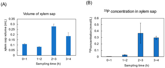 Changes in xylem sap volumes and the 33P concentration in xylem sap under light conditions. (A) volume of xylem sap, and (B) 33P concentration. n = 3.