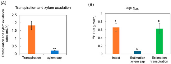 Estimation of 33P flux using 33P concentration of xylem sap in comparison with the 33P flux in the intact plant. (A) The transpiration rate and xylem sap exudation rate. (B) Estimation of the 33P flux based on xylem sap exudation rate and that based on transpiration rate. n = 3. ** indicates statistically significant at p < 0.01 using Student’s t-test. Different letters indicate the significant difference in the values among treatments using Tukey’s method.