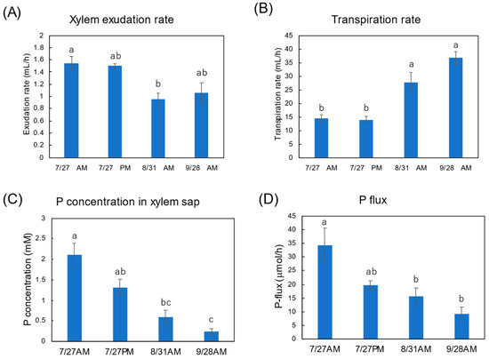 Figure 9A shows the exudation rates of the xylem sap during AM and PM on 27 July, AM on 31 August, and AM on 28 September. The xylem sap exudation rate between AM and PM on 27 July were similar, but they decreased on 31 August and on 28 September. The transpiration rates from the cut shoot during AM and PM on 27 July were the same, but they increased on 31 August and on 28 September. The Pi concentration in the xylem sap collected during the afternoon of 27 July tended to be lower than that collected during the morning. The P concentration in the xylem sap significantly decreased along with the growth stages. Figure 9D shows the estimated PO4-flux in at the various stages. The estimation of the P flux is based on the P concentration in the xylem sap and the xylem exudation rate plus the transpiration rate. The P flux during AM on 27 July was 34.2 μmol/h, and it was higher than that during PM on 27 July (19.6 μmol/h), on 31 August AM (15.8 μmol/h), and AM on 28 September (9.3 μmol/h).
