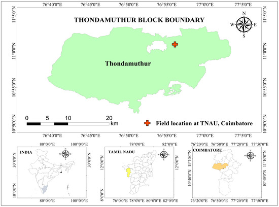 The experiment was conducted at the Eastern Block Farm of Tamil Nadu Agricultural University (TNAU), Coimbatore, Tamil Nadu, during the kharif and rabi seasons of 2023–2024. The experimental farm’s location is shown in Figure 1. It is located in Tamil Nadu’s Western Agroclimatic Zone with the coordinates of 11° N latitude and 77° E longitude, and it has an elevation of 426.7 metres above mean sea level. The study was carried out under a randomised block design with fourteen treatments of indigenous technical knowledge (ITK) formulation for weed management under organic maize cultivation, viz., (i) PE AA@20%; (ii) PE CU@10% + AA@10%; (iii) PE CU@10% + CS@10% + AA@10%; (iv) PE CS@10% + AA@10% + TC@10%; (v) EPOE AA@20%; (vi) EPOE CU@10% + AA@10%; (vii) EPOE CU@10% + CS@10% + AA@10%; (viii) EPOE CS@10% + AA@10% + TC@10%; (ix) POE AA@20%; (x) POE CU@10% + AA@10%; (xi) POE CU@10% + CS@10% + AA@10%; (xii) POE CS@10% + AA@10% + TC@10%; (xiii) hand weeding; and (xiv) weedy check (where, CU: cow urine, CS: common salt, AA: acetic acid, TC: Terminalia chebula, PE: pre-emergence, EPOE: early postemergence, and POE: postemergence), and the hybrid maize COH(M) 6 variety, released by TNAU, was used as the test crop. The experiment was replicated three times with a plot size of 4.5 × 3.5 m2. The plant spacing followed in the experiment was 0.6 × 0.2 m2.