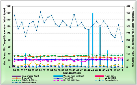 Meteorological data were collected from the Department of Agroclimate Research Centre, TNAU, Coimbatore, for the experimental period (Figure 2). The mean maximum and minimum temperatures of 34.3 °C and 21.7 °C, respectively, were recorded during the 24th and 51st standard meteorological weeks. Throughout the experimentation period, a total rainfall of 5.81 cm was received, with November alone accounting for 67.36% of this total. Notably, the maximum weekly rainfall of 158 mm was observed during the 45th standard meteorological week. The mean maximum and minimum relative humidity values were 92.10% and 44.80%, respectively, recorded during the 45th and 24th standard meteorological weeks. Soil samples were randomly collected from the top 0–30 cm at the experimental site and thoroughly mixed to form a composite sample. Physical and chemical analyses revealed that the soil at the experimental site was classified as a sandy clay loam texture, with an alkaline pH of 8.27, high salinity (0.17 dS m−1), and a medium level of organic carbon (4.68 g kg−1). The soil exhibited low levels of available nitrogen (238 kg ha−1) and phosphorus (22.97 kg ha−1) but was high in available potassium (602.43 kg ha−1).