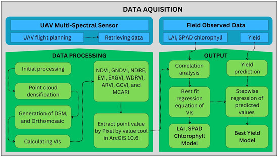 Remote sensing, an integral component of human vision, allows for the observation and understanding of various object attributes within the visible wavelength range of 380 to 700 nm. This capability, often referred to as having “eyes in the skies”, has expanded with advancements in remote sensing equipment, offering a broader wavelength range. Unmanned aerial vehicles (UAVs) are increasingly used in agricultural surveillance due to their cost-effectiveness, enhanced temporal and spatial resolutions, varied sensor configurations, and altitude adaptability [1,2]. They provide real-time precision in assessing crop health, predicting yields, and mapping soil properties with heightened accuracy. Multispectral sensors mounted on UAVs provide a solution to the recurring issue of limited high-resolution data for yield mapping [3,4,5]. In addition, the integration of high-resolution imagery and spectral data enhances decision making in agriculture [6,7].