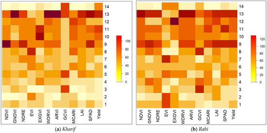The range of values for the different vegetation indices, viz., NDVI from 0.614 to 0.729 and 0.784 to 0.816, GNDVI from 0.660 to 0.552 and 0.659 to 0.705, NDRE from 0.107 to 0.140 and 0.166 to 0.208, EVI from 0.012 to 0.014 and 0.014 to 0.018, EXGVI from 0.362 to 0.464 and 0.507 to 0.603, WDRVI from −0.078 to 0.128 and 0.250 to 0.332, ARVI from 0.396 to 0.545 and 0.750 to 0.681, GCVI from −0.006 to −0.007 and −0.006 to −0.008, MCARI from 0.011 to 0.015 and 0.016 to 0.026 during the kharif and rabi, respectively. Certain pixel portions exhibit sensitivity to nonphotosynthetic materials and background soil qualities, as indicated by very low indices and negative values. The range of the field observed values, which include LAI, SPAD chlorophyll, and yield, were 2.35 to 3.56, 38.77 to 55.23, and 96.26 to 112.3 g plant−1, respectively, during the kharif season and 2.55 to 3.59, 38.46 to 58.63, and 84.44 to 125.99 g plant−1 during the rabi season, respectively. Figure 4 revealed that the VI values, LAI, and SPAD chlorophyll readings differ from one another. This is due to differences at the field level, as the research field consisted of different treatments of Indigenous Technical Knowledge (ITK)-based formulations along with different times of application for weed management in maize for experimental purposes.