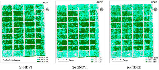 The primary tools exploited for assessing the UAV imagery were VIs. Initially, ArcGIS 10.6 software was employed to generate vegetation index maps from the processed images. The processed data were then used to extract information through vegetation index expressions. The vegetation index is crucial for assessing crop growth vigour, yield, and nutritional status. The VIs such as NDVI, e.g., normalised difference vegetation index (NDVI), green normalised difference vegetation index (GNDVI), normalised difference red-edge index (NDRE), enhanced vegetation index (EVI), excess green vegetation index (ExGVI), wide dynamic range vegetation index (WDRVI), atmospherically resistant vegetation index (ARVI), green chlorophyll vegetation index (GCVI), and modified chlorophyll absorption ratio index (MCARI)] from Table 2 were valuable for predicting leaf area index, NDVI, and chlorophyll. Using ground data coordinates, the pixel-by-value tool in ArcGIS 10.6 was then employed to obtain various VIs from spectral data. Finally, the statistical analysis was conducted on the retrieved VIs data.