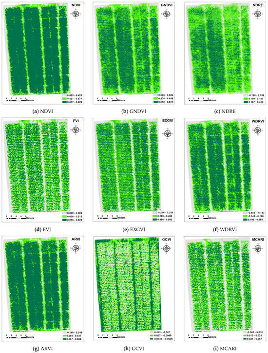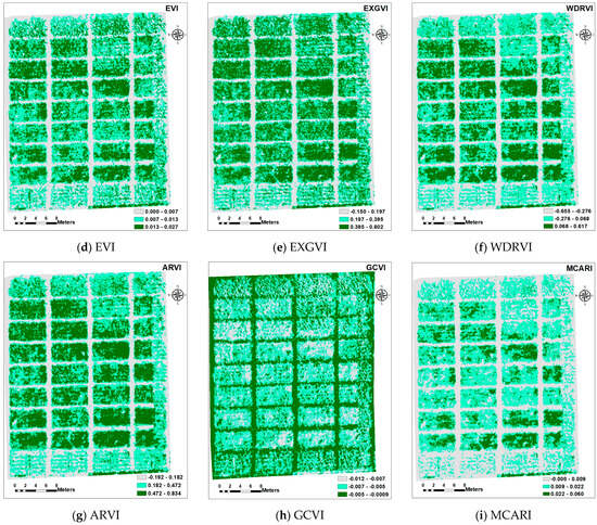 Spatial variability of vegetation indices (VIs) during the rabi season: (a) normalised difference vegetation index (NDVI); (b) green normalised difference vegetation index (GNDVI); (c) normalised difference red-edge index (NDRE); (d) enhanced vegetation index (EVI); (e) excess green vegetation index (ExGVI); (f) wide dynamic range vegetation index (WDRVI); (g) atmospherically resistant vegetation index (ARVI); (h) green chlorophyll vegetation index (GCVI); (i) modified chlorophyll absorption ratio index (MCARI).