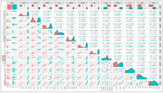 Correlation between vegetation indices (VIs) against leaf area index (LAI) and SPAD chlorophyll of the kharif and rabi maize. Note: Levels of significance: * p < 0.05, ** p < 0.01, and *** p < 0.001. K: kharif; R: rabi.