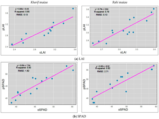 A strong correlation was found between observed LAI and SPAD, with the predicted LAI recording R2 values of 0.85 and 0.79, along with RMSE values of 0.13 each. Similarly, the predicted SPAD showed R2 values of 0.83 and 0.82, accompanied by RMSE values of 1.82 and 2.71 in the kharif and rabi seasons, respectively. Similarly, the predicted yield exhibited R2 values of 0.51 and 0.74, with RMSE values of 6.33 and 5.57, during the kharif and rabi seasons, respectively. These results suggest that the yield was influenced by both LAI and the chlorophyll content of maize.