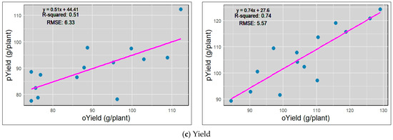 The observed values of LAI and SPAD chlorophyll were examined for correlation with the yield in order to estimate the yield model. While SPAD chlorophyll and LAI were taken into account as predictor variables, the yield was considered the predicted variable. A variety of combinations of the predictor and predicted variables were regressed in order to find the best regression equation for forecasting the yield model (Figure 3).