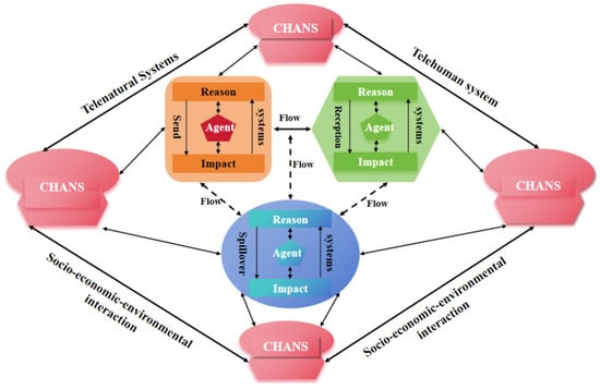 Natural systems at different distances form interactions between their environments through teleconnections. Human systems at different distances form interactions between different socioeconomic through interaction. Telecoupling occurs when human and natural systems become interconnected and overlap, allowing for socioeconomic and environmental interactions between distant human and natural systems [12,24]. A telecoupling system consists of five interacting parts: system, flow, agent, cause, and effect. Each human–nature coupling system consists of three parts: agent, cause, and effect. These form a complete human–nature telecoupling mega-system through the bonds of interaction between streams. Because of differences in the directions of the flow, the system presents three different states of the system: sending, receiving, and spillover (Figure 1).