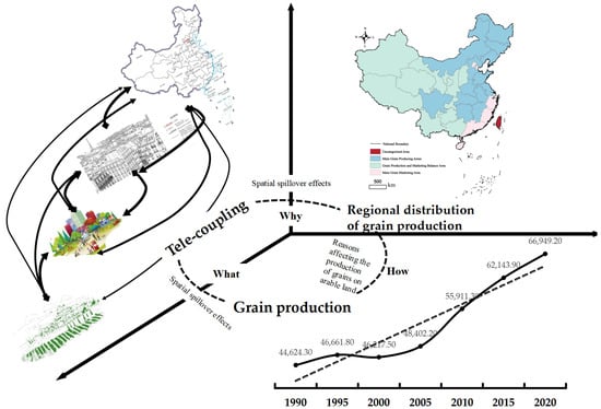 Liu et al. explicitly proposed the research concept of telecoupling in 2013 [12]. The coupling relationship between humans and nature is characterized by system evolution, mutual feedback loops, time delay, heterogeneity, and mutation. They created and led the international Coupled Human and Natural Systems (CHANS) project, which emphasizes the interactions between socioeconomic and environmental systems of coupled human–natural systems at long distances, and the need to focus on comparative studies between systems at different scales [13]. Martin-Lopez et al. [14] used the theory of telecoupling to construct a framework for analyzing “cross-scale influence-dependence”, considering cross-scale social relations as an inter-regional flow related to ecosystem service assessment; this provides support for the part of telecoupling research that has yet to be recognized. In recent years, as the process of global integration deepens and the ties between countries and regions become increasingly close, a series of socioeconomic–environmental impacts spanning across countries, regions, and scales have emerged [15]. Using this theoretical framework, scholars have conducted in-depth discussions on ecosystem services [16], the “Belt and Road” strategy [17], and energy, and have also made some progress in the area of land use change. Nef et al. systematically examined the intricacies of cross-scale dynamics and the identification of factors contributing to vulnerability across various temporal and spatial scales, ultimately leading to food insecurity in a specific location [18]. This is achieved through a combination of a case study conducted in northern Vanuatu and a broader conceptualization of socioeconomic dynamics within a telecoupling framework. The Netherlands promotes food and land security, as well as socioeconomic development, through the enhancement of technology and the importation of land-intensive products such as food to offset domestic consumption [19,20]. In terms of spatial dimensions, telecoupling involves cross-regional long-distance coupling and cross-scale interactive coupling across multiple nested spatial scales between humans and within the natural coupled system [21]. There are 31 provinces (municipalities and autonomous regions) in mainland China, and the center of gravity of the grain production region has gradually shifted northward. On the one hand, this shift has occurred across the spatial scale and across natural and administrative boundaries; thus, and the regional pattern of grain production has been gradually formed and perfected, with the major grain-producing areas being coupled with the main grain-marketing areas, with a clear distance. On the other hand, human–nature interactions have a decisive impact on distant markets and ecosystems through grain production and marketing across political boundaries.