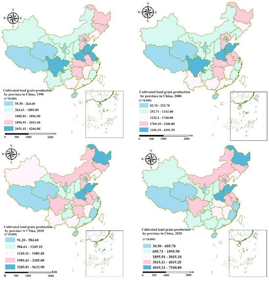 China’s grain production has experienced fluctuating overall growth over the past 30 years. CLGP steadily increased from 4.46 × 108 t to 5.05 × 108 t million tons from 1990 to 1996. There was a sustained decline in grain production between 1997 and 2003, but from 2004 onwards, 14 years of production increases were achieved. It is worth noting that 2018 saw a reduction in grain production from 2017 by 0.56%, but growth was again realized by 2020. From the point of view of the growth of the region, over the past 30 years, Nei Mongolia Autonomous Region saw the largest increase of 276.58%. Northeast Heilongjiang Province showed the second largest growth period, from 2.31 × 108 t in 1990 to 7.55 × 108 t million tons, with a growth rate of 226.09%. Through ArcGIS, Natural Breaks was used to segment China’s grain output of cultivated land between 1990 and 2020 (Figure 3), which shows that China’s annual grain output has gradually increased. In 1990, the high-grain-yielding areas were Shandong Province, Jiangsu Province, Hunan Province, Sichuan Province, and Henan Province. Meanwhile, in 2000, the fifth level of high-grain-yielding areas included Shandong Province, Henan Province, Jiangsu Province, and Sichuan Province. In 2010, the fifth level of high-grain-yielding areas included Shandong Province, Hunan Province, Jiangsu Province, and Henan Province. In 2020, the fifth level of grain production areas changed to Heilongjiang Province, Henan Province, and Hunan Province; the high-grain-production areas gradually shifted to North and Northeast China. In addition, the analysis shows that grain production in northern regions such as the Nei Mongolia Autonomous Region and the Northeast Plain has increased significantly due to the collectivization of cultivated land and the improvement in land quality. In areas in the southern region, such as the Pearl River Delta region, we can observe the deepening of the urbanization process with the formation of a hub of development in the secondary and tertiary industries; here, the supply of food to the south from the north has fed the situation. The northeastern region has witnessed a change from the previous situation, where it was the “Great Northern Wilderness”; this region has become one of the most important regions in China for stabilizing the “ricebowl”.
