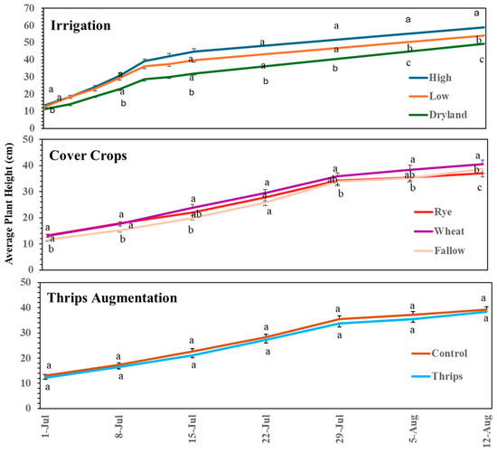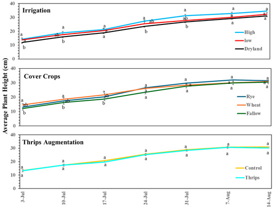 Temporal change in plant height influenced by irrigation level, cover crop type, and thrips treatment Lubbock, TX, USA, 2022. Values with different lowercase letters within each sampling date are significantly different (p < 0.1).