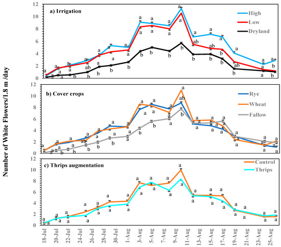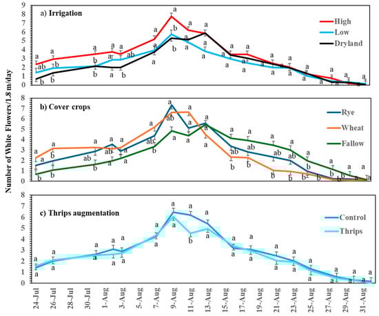 White flowers in cotton were influenced by irrigation level, cover crop type, and thrips treatment in the year 2022. Values with different lowercase letters within each sampling date are significantly different (p < 0.1).