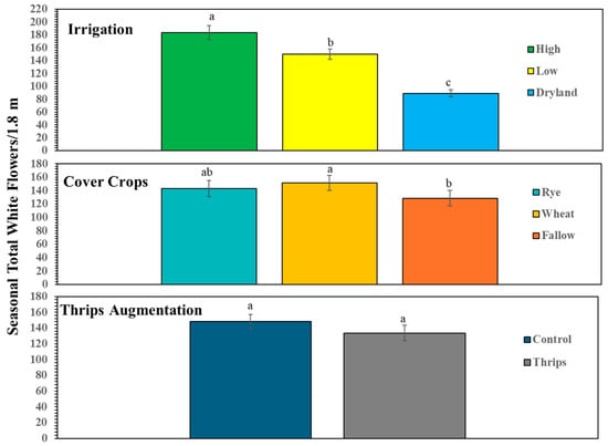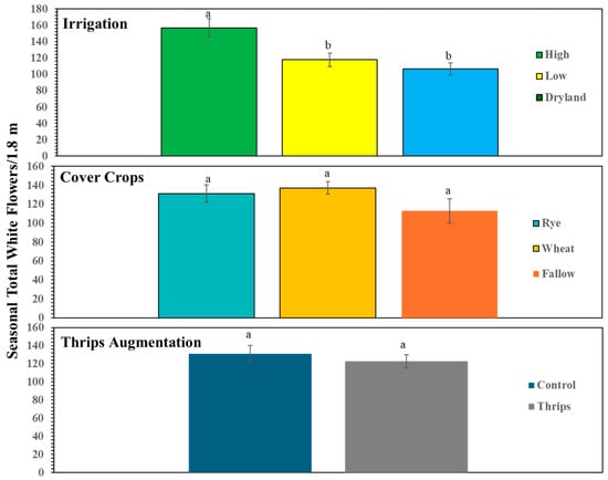 Average seasonal white flower density (total flowers per 1.8 m cotton row) influenced by irrigation level, cover crop type, and thrips augmentation. Bars above the mean values are standard errors. Bars with different letters indicate significant differences between treatments. Lubbock, TX, USA, 2022.