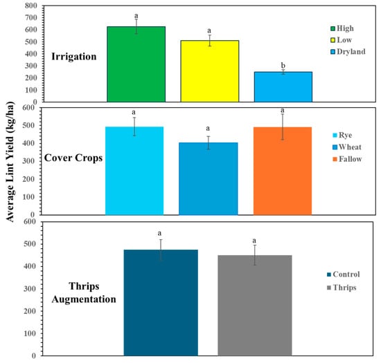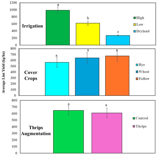 Average (±SEM) lint yield influenced by irrigation level, cover crop, and thrips augmentation, Lubbock, TX, USA, 2022. Values with different lowercase letters within each main treatment are significantly different (p < 0.1).