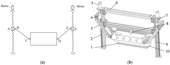 Considering the complex physical characteristics of the tea canopy, the profiling tea harvesting device employs a segmented arrangement of multiple tea harvesting units for enhanced efficiency in profiling and harvesting. Each PTHU includes a set of end actuators for harvesting fresh tea leaves, and the profiling movement of the actuators was realized by the cutter profiling mechanism. To achieve fast profiling of the end actuator, a cutter profiling mechanism driven independently by dual power sources was designed, and its mechanism diagram is shown in Figure 1. The ball screw was selected as the lifting component and arranged on both sides of the actuator. The slider in the lifting component slides up and down through the motor drive on both sides. Concurrently, each slider is linked to both ends of the cutter via a connecting rod. This configuration transforms the vertical motion of the slider into adjustments in both the height and orientation of the cutter.