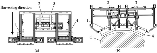 The profiling device needs to be designed according to the characteristics of the canopy shape and be able to achieve one-time harvesting of the target fresh leaves on the entire canopy. Based on the characteristics of the end effector, three sets of identical PTHUs, “left, center, and right”, were arranged in segments on the chassis to adapt to the fresh leaf harvesting of curved tea canopy. Figure 2 shows the layout diagram of three groups of PTHUs. The end actuator in each PTHU corresponds to the top and both sides of the tea canopy, respectively, and were arranged in an isosceles triangle shape in the same horizontal plane. Meanwhile, to avoid any movement interference during the profiling tea harvesting operation of each unit, the left PTHU and the right PTHU were arranged at the front end of the rack side by side, and the middle PTHU was located at the rear side of the middle position between the units above.