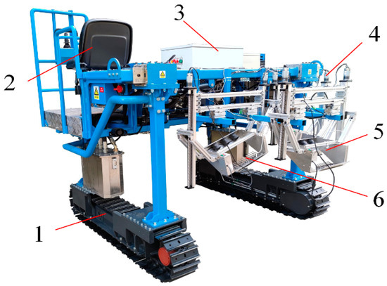 Structure of ordinary tea profiling harvesting device. 1. Crawler type high clearance platform. 2. Driver’s seat. 3. Control box. 4. Right PTHU. 5. Middle PTHU. 6. Left PTHU.