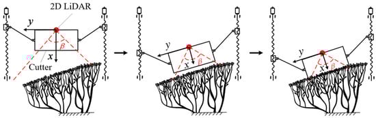 LiDAR can quickly obtain the depth information of surrounding objects, and its non-contact measurement features high detection accuracy, portability and reliability [14,21,22]. According to the motion characteristics of the cutter profiling mechanism and the layout of the whole machine, in combination with the actual application scenario of profiling harvest of fresh tea leaves, 2D LiDAR was selected in this study to sense the tea canopy height. This choice was based on its relatively simple structure, low weight, minimal power consumption, and cost-effectiveness. A 2D LiDAR was installed in the middle of the end actuator of each PTHU. Figure 4 illustrates a schematic diagram of canopy height perception based on 2D LiDAR.