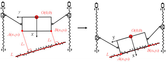 Figure 5 illustrates the establishment of the moving rectangular coordinate system with the LiDAR ranging core O as the origin. After collecting the LiDAR information, the main controller processed this data to obtain the 2D point cloud information of the canopy. Subsequently, it derived the optimal linear equation, L, representing the canopy’s profile through the application of a linear fitting algorithm. Under the established moving rectangular coordinate system, the coordinates of points A and B at both ends of the cutter were determined. The shortest distance from A and B to line L (L1 and L2) could be calculated in real time. Then, the L1 and L2 were used as the initial input of the control system and the real-time feedback of the current spatial position of the end harvesting actuator to realize the motion control of the motor on both sides. Based on these, the cutter surface of the ETPA could be kept close to the fitted tea tree canopy surface and within the predetermined height range to achieve the expected profiling action.