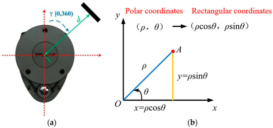 Schematic diagram of RPLIDAR A1 ranging information coordinate conversion. (a) Geometric definition of RPLIDAR A1; (b) polar–rectangular coordinate conversion.