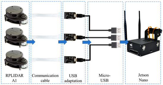 According to the structure scheme of the tea harvesting device in Section 2.1, three RPLIDAR A1s were connected to the Jetson Nano, and the data transmission method is shown in Figure 7. The same synonymous file was created according to the previous steps. The corresponding publisher’s object name was modified, followed by the subscriber’s object name and ROS node name, and the corresponding content modifications were made to the launch files of each RPLIDAR A1.