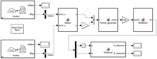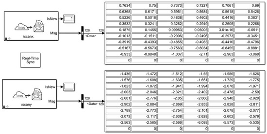 This study used a ROS system (ROS1) and MATLAB 2020a Simulink to realize the communication between Linux (Ubuntu 18.04) and Windows (Win10) based on WLAN. As a visual simulation tool, Simulink’s environment characteristics and programming language can better meet the real-time processing of LiDAR point cloud information and the subsequent development of a motion controller [26]. This study needed to obtain the complete point cloud information of each 2D LiDAR, including the x-coordinate data and y-coordinate data of the measured point. At the same time, the scanning angle resolution was set to 1°, and the final output of the scanning coordinates within the target angle range was 60. The Simulink program was compiled and executed for online simulation, as shown in Figure 8. And the Simulink could receive the x-coordinate data and y-coordinate data of the points measured by the LiDAR after the scanning angle range was limited to one scanning cycle.
