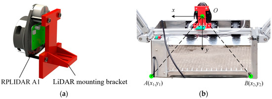 In the hardware implementation of the equipment, LiDAR was installed on the ETPA through the mounting frame (3D printing manufacturing) as shown in Figure 9a. The installation position should ensure that there was no blade shielding under the scanning surface. For the collected point cloud information within the specified scanning interval of the LiDAR, the RANSAC algorithm was used to solve the problem in real time to obtain the best canopy cutting fitting line. As shown in Figure 9b, with the LiDAR ranging core as the coordinate origin, the coordinates of the two end points of the cutter could be expressed as A (x1, y1) and B (x2, y2), and both were fixed coordinate points in the LiDAR coordinate system. And the measured values were A (200, 190) and B (−200, 190), in mm. According to the above real-time fitting results of the best fitting line and the known coordinate points and other conditions, the shortest distance between the points A and B to the current fitting line could be calculated in real time. Meanwhile, the distance obtained from both sides were used as the position feedback of the current end effector and the required profiling height estimation, which was used as the initial input of the motion control system of each PTHU in the subsequent solution.