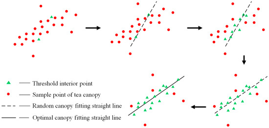 Figure 10 shows the iterative process of curved point cloud line fitting based on RANSAC. The main method steps include: (1) Treating all sample points as selected objects. (2) Randomly selecting 2 points from the sample points to fit a straight line. (3) Counting the number of points within a certain threshold range for the straight-line model obtained from 2. (4) Repeating the process 2 and 3 multiple times until the model with the highest number of points within the threshold is found. (5) Using all threshold points to re-estimate the model. (6) Choosing the most supported model as the solution. Specifically, through multiple random sampling and fitting, the sample points of the tea canopy surface in a certain direction were obtained by LiDAR scanning. The number of sampling points that met the threshold condition were counted in each fitting result. Finally, the result with the highest number of points within the threshold was used as the optimal fitting line. The fitting programming was accomplished using MATLAB language and a MATLAB Function block within Simulink. Furthermore, a modular program interface for estimating the profiling height, based on the RANSAC algorithm for single LiDAR ranging, was developed, as depicted in Figure 11. The shortest distance value from the two ends A and B of the cutting blade was taken as the best fitting straight line for the roof cutting in this round of scanning as the output.