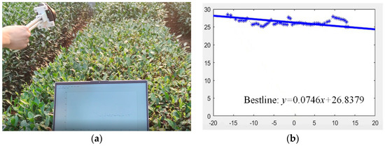 The field experiment of the point cloud processing method. (a) LiDAR scanning testing environment; (b) The measured points on the canopy surface and the best fitting straight line.
