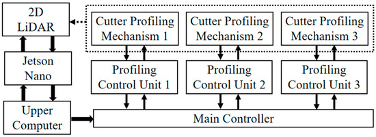 According to the field operation requirements of the profiling tea harvester, it was ensured that each PTHU could complete the expected tasks such as canopy height detection, cutter profiling motion execution, and end current position feedback. It should be able to achieve real-time processing of multi-source data. The electronic control system of the whole machine adopted a segmented architecture design with a simple structure, as shown in Figure 13. The system model was composed of a 2D LiDAR, Jetson Nano, upper computer, main controller (MCU) and profiling control unit nodes. The 2D LiDAR scanned and output the distance information from the current ETPA to the canopy in real time. The Jetson Nano acquired the data and realized data interchange with the upper computer. The upper computer and the main controller were responsible for the online processing of the distance information detected by each laser LiDAR. The corresponding profiling control decisions were made according to the current spatial position of the end tea harvesting actuator. Among them, the real-time scanning data from the 2D LiDAR installed on the tea harvesting actuators at each end was used as both the distance information of the current canopy surface and the real-time feedback of the position and attitude status of the current actuator. In this study, according to the actual width of the tea harvesting canopy, there were 3 groups of profiling control unit nodes, which correspond to the left, middle and right groups of PTHUs in turn.
