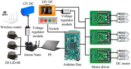 The hardware of the electric control system of the harvesting device designed in this study included a 2D LiDAR, Jetson Nano, PC, MCU, DC power supply, voltage transformation module, DC motor, DC motor driver, control switch, wireless router, serial port device for communication with an industrial control computer and an upper computer. Figure 14 is the schematic diagram of the hardware composition of the electronic control system of the whole machine. The MCU used an Arduino Due development board (32-bit ARM Cortex-M3 chip), with 54 digital input/output interfaces (12 of which can be used as PWM output) and 12 analog input interfaces. Meanwhile, the DC motor control scheme based on PWM technology was adopted for the research on the profiling motion control of the cutter profiling mechanism.