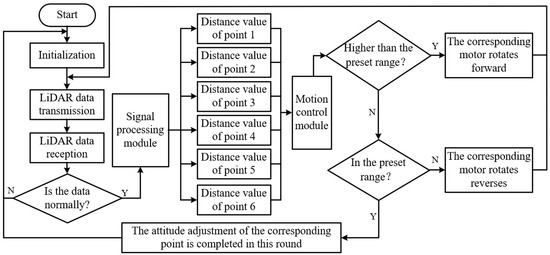 Each PTHU realized the adjustment of the height and inclination of the ETPA through two motors on both sides. To facilitate the motion control of each motor, the two motors of the left PTHU were named motor 1 and motor 2 from left to right in the view direction in combination with Figure 3. The points on both sides of the cutter corresponding to each motor were named as point 1 and point 2. Similarly, the middle PTHU had motor 3, motor 4, cutter point 3 and point 4. The right PTHU had motor 5, motor 6, cutter point 5 and point 6. The control system flow of the whole machine was finally drawn as shown in Figure 15.