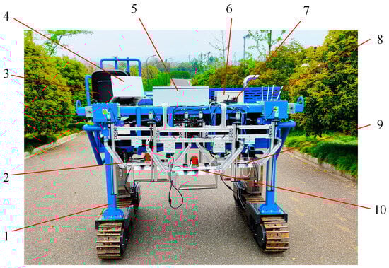 In order to better adapt to operation in mountainous tea plantations, the chassis of the device adopts a crawler type high clearance platform, which brings strong climbing ability and field driving ability to the equipment. On this basis, the completed structure of the prototype is shown in Figure 3.