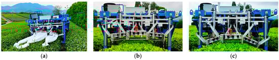 As an important economic crop with Chinese agricultural characteristics and a cultural heritage, tea has great social value and economic significance [1]. Based on the varying criteria for the raw materials of fresh tea leaves, it can be categorized into ordinary tea and famous tea. The production of ordinary tea generally surpasses that of famous tea. Generally, the harvesting of fresh ordinary tea leaves requires large labor input and high operation intensity [2]. In recent years, the aging trend of the agricultural labor force is obvious. And the contradiction between the small harvest window period and the shortage of labor has become a bottleneck restricting the development of the tea industry. Therefore, there is an urgent need for tea harvesting equipment that can not only ensure the harvest quality but also achieve large-scale harvesting operations across the diverse terrains of China’s tea-producing region. For the ordinary tea harvest, single- or double-person handheld tea harvesting machines are widely used in China, which both use a reciprocating cutter as the harvesting methods, but the personnel are subject to the weight of the machines themselves, resulting in high operation intensity and low efficiency [3]. To improve work efficiency, self-propelled tea harvesting machines have gradually been applied, increasing the automation of tea machine picking to a certain extent [4]. However, their cutter height is fixed and cannot be adjusted adaptively according to the canopy and terrain characteristics during traveling, causing a lower completeness rate of harvest of tea buds and leaves, as well as a higher content of impurity.