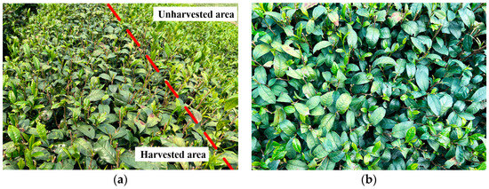 The tea canopy surface after harvesting. (a) Comparison between harvested and unharvested areas; (b) Top view of tea canopy surface for test.