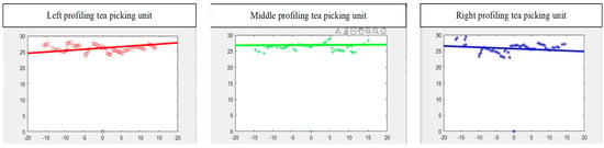 During the operation of the prototype, the chassis of the prototype ran normally. The three sets of PTHUs achieved the expected profiling tea harvesting action normally, moving to the desired cutting position while following the shape of the tea canopy. After the machine harvesting operation, the tea tree harvesting surface was neat; the height was consistent; the incision was flat; and the branches of the tea tree were in good condition. At the same time, considering the unevenness of the terrain, the profiling unit could meet the design requirements to achieve profiling harvesting of the tea canopy surface. Figure 21 shows the real-time display interface of the fitting line of the canopy in the test.