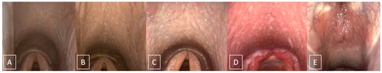 The presence and grade of PLH were assessed using a visual assessment of the nasopharyngeal mucosa using a 0–4 points PLH scale following Holcombe et al. [] (Table 3). Based on the PLH scale, horses were classified as PLH-free (grade 0), grade 1 PLH, grade 2 PLH, grade 3 PLH, or grade 4 PLH, as shown in Figure 1. Additionally, the nasopharyngeal mucus was quantitatively assessed using a modified 0–3 points scale following Koblinger et al. [] (Table 3).