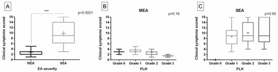 In horses with confirmed EA, the severity of clinical symptoms reflected by the clinical symptoms scores was significantly higher in SEA than in MEA horses (Figure 2A; p < 0.0001). Therefore, the PLH grade-related differences were compared in SEA and MEA groups, separately. However, in both groups MEA (Figure 2B; p = 0.16) and SEA (Figure 2C; p = 0.09) groups, there were no differences in the severity of clinical symptoms between grades of PLH.