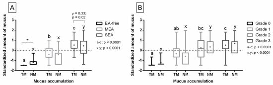 Standardized amount of tracheal mucus (TM) and nasopharyngeal mucus (NM) compared considering (A) equine asthma (EA) presence and severity (EA-free, mild–moderate equine asthma (MEA), severe equine asthma (SEA)) and considering (B) pharyngeal lymphoid hyperplasia grades (PLH; including grades 0–3). Data on box plots are represented by lower quartile, median, and upper quartile, whereas whiskers represent minimum and maximum values. Additionally, the mean values are marked by “+”. Asterisks indicate differences between TM and NM for p < 0.05 (*, p < 0.01); ρ and p indicate significant Spearman correlations between TM and NM for p < 0.05; and lowercase letters indicate differences between EA-related or PLH-related groups for p < 0.05.