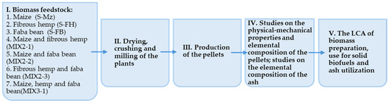 The pellet biomass raw material used in our study was grown in 7 different fields in the multi-crop experiment at the Experimental Station of Vytautas Magnus University Agriculture Academy (Lithuania), in 2020–2022 by Romaneckas et al. [39] according to the methodology of the mentioned authors. Each of the mentioned plants was grown in three different fields as a monocrop; in another three fields, two plants were grown together in one field (3 fields with different combinations of plants); and in one field, all three plants were grown together (trinomial crop). According to the plot from which the biomass was taken, 7 types of pellets were produced: pellets from maize biomass (S-Mz), fibrous hemp biomass (S-FH), faba bean biomass (S-FB), maize and fibrous hemp (grown in the same field) biomass (MIX2-1), maize and faba bean (grown in the same field) biomass (MIX2-2), fibrous hemp and faba bean (grown in the same field) biomass (MIX2-3), and maize, hemp, and faba bean (grown in the same field) biomass (MIX3-1). Biomass samples were collected over a period of three consecutive years. Every year, biofuel pellets were produced from the collected biomass under laboratory conditions, and their quality parameters were tested. It was analyzed how the main parameters of the pellets met the requirements of the standard ISO 17225-6:2021 [40]. This standard defines the quality requirements for non-wood biofuels. After evaluating the quality of the pellets, in the next stage, the LCA of the use of biomass for solid biofuel was carried out.