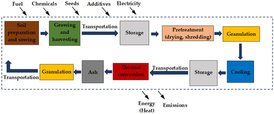 The LCA includes procedures to systematically assess the environmental impact of bioenergy production from both cradle-to-gate and cradle-to-grave (waste disposal). Usually, under the cradle-to-gate system boundaries, the LCA includes only a partial product life cycle from the raw material collection (“cradle”) to before the product is transferred to the consumer (“gate”) [55]. A full LCA of biomass preparation for pressed biofuel starts with biomass cultivation. It ends with waste (ash) disposal after briquette/pellet conversion to energy, including the environmental impact of the main equipment used during its operation [56]. Most studies apply the impacts of activities involved in the wood-based product granulation, transport, and use of materials and fuels. The comprehensive view provided by the LCA allows environmental impacts to be assessed on a whole system basis analyzing the agro-industrial value chains, such us in-tended crop cultivation, treatment, harvesting, collection, transportation, size reduction and screening, drying, granulation, storage, and utilization for heat [57].