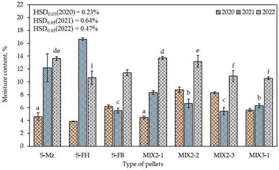 The moisture content of the produced pellets. In the figure, any two samples with a common letter are not significantly different, as assessed using the least significant difference.