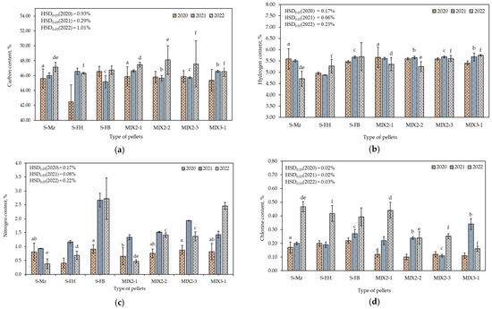 The content of (a) C, (b) H, (c) N, and (d) Cl in the produced pellets. In the figure, any two samples with a common letter are not significantly different, as assessed using the least significant difference.