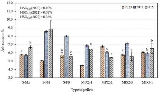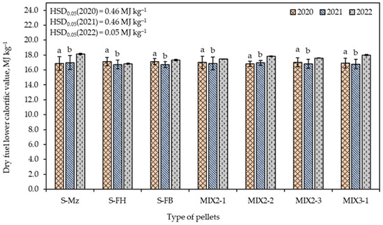 The O content in the produced pellets varied from 38.07% (S-FB variant, 2021) to 47.11% (S-FH variant, 2020). The H content ranged from 4.71% (S-Mz pellets, 2022) to 5.75% (MIX3-1 variant, 2022). The C content varied from 42.47% (S-FH variant, 2020) to 48.10% (MIX2-2 variant, 2022). The maximum permissible amount of N, S, and Cl in solid granulated biofuel was determined by the standards. Only in three pellet variants (S-FB variants in 2021 and 2022, and the MIX3-1 variant in 2022) did the N content exceed the maximum value (2.0%) set by the ISO 17225-6:2021 standard. The higher N concentration in the faba bean biomass in the second and third year of the experiment could be due to the ability of these plants grown in the same field during the experiment to accumulate nitrogen. In all other variants, the N content remained below this limit. It should be noted that the S levels in all pellets were very low and did not surpass the maximum limit of 0.20% for class A pellets, as established by the ISO 17225-6:2021 standard. In three pellet variants (S-Mz, S-FH, and MIX2-1 variants in 2022), the Cl content slightly exceeded the maximum limit of 0.40% set by the standard for class B pellets, while in the other variants, the Cl content adhered to the specified norms. As indicated by Podlesna [68], the concentration of Cl in plants and their tolerance to its excess in the soil varies. With its high availability in the environment, its excessive accumulation is possible because Cl is readily absorbed from the soil and directly from the air. The Cl concentration in plant biomass is also affected by nitrogen fertilization. To objectively assess the causes of Cl change in the biomass of the plants we studied, more detailed studies are needed. The Cl content of maize stover pellets was found to be 0.53%, by Zapata et al. [69], which was above the acceptable limit. This illustrates that higher than allowed Cl content in herbaceous biomass found in some cases is one of the problems for which solutions need to be proposed.
