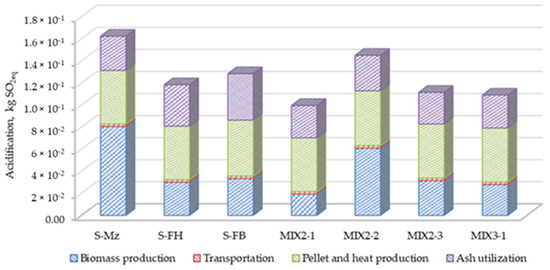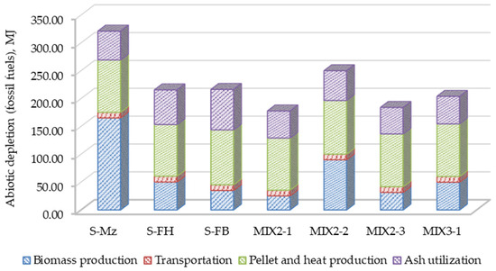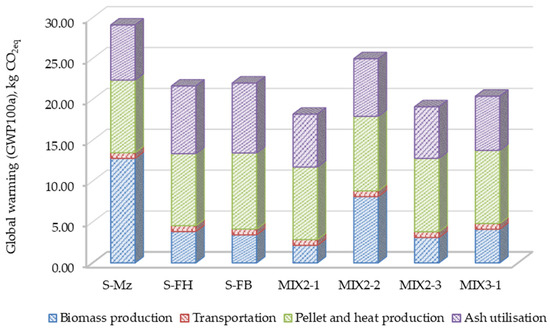 Analysis of the four impact categories shows that pellet and heat production is usually the phase with the biggest contribution to the environment primarily due to the high consumption of electricity at this stage. Biomass production had the largest contribution to all four impact categories in the case of the S-Mz scenario, which obtained the lowest yield compared to the other six scenarios. This fact shows that to reduce the negative impact on the environment, biofuel production from agricultural plants should be focused on high-productivity crops.