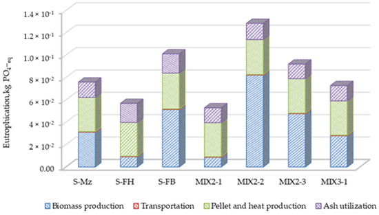 Eutrophication is one of the most frequently analyzed impact categories in the LCA of biofuel production [34]. The contribution of different processes to eutrophication is illustrated in Figure 10.