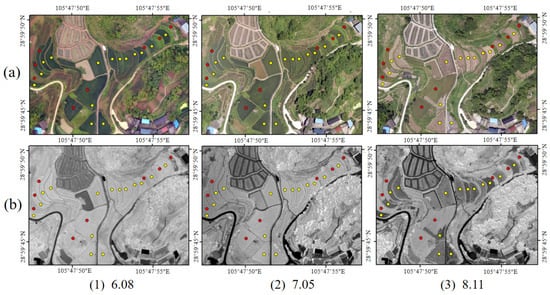 To compare various ground feature samples at different periods (Figure 2), Figure 2a illustrates the unmanned aerial vehicle remote sensing image, while Figure 2b represents the computed NDVI image. The colors, ranging from dark to light, indicate low to high NDVI values. According to Figure 2, it can be observed that there is relatively little overall change in the ground features and their corresponding NDVI values in the sample areas between 8 June and 5 July 2023. However, between 5 July and 11 August 2023, there is noticeable harvesting occurring in certain rice fields, accompanied by significant changes in their NDVI values. Therefore, for ease of analysis, the rice fields are highlighted through marking, with red marking indicating unharvested rice and yellow marking indicating harvested rice. Specifically, the rice fields that experienced harvesting show a significant decrease in NDVI values, while the NDVI values in the rice fields that are not harvested remain relatively stable. Additionally, there are no significant changes observed in other land classes.