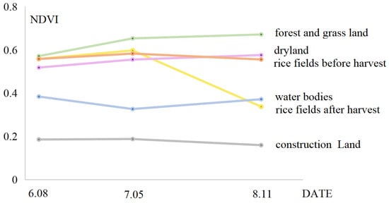 Through the analysis of time-series NDVI curves for various ground features in the sample area, it was found that the NDVI values of forests and grasslands are generally higher than those of other land categories. Rice fields and dry land have intermediate values, while construction land and water bodies have the lowest NDVI values. From 8 June to 5 July, the NDVI values of rice fields, forests and grasslands, and dry land all show upward trends, while the NDVI values of water bodies exhibit a downward trend. The NDVI values of construction land remain relatively unchanged. From 5 July to 11 August, the NDVI values of forests and grasslands, as well as dry land, continue to rise slightly. In contrast to earlier changes, the NDVI values of water bodies start to increase, while the NDVI values of construction land remain relatively stable. Unlike other ground features, the harvested rice fields experience a significant decrease in NDVI values from 5 July to 11 August, with a difference of 0.26. However, the NDVI values of non-harvested rice fields remain relatively stable. This indicates that the variation in NDVI values for rice fields during this period differs from other land types. For the rest of the period, the trends and degrees of change in NDVI values for all ground features are similar.