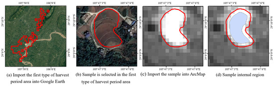 where NDVIt1 is the NDVI value of the preharvest period of rice fields, and NDVIt2 is the NDVI value of the postharvest period of rice fields. To extract rice fields and determine the extraction threshold, if the NDVI values are greater than the threshold, they are classified as rice fields; otherwise, they are classified as other land types. To calculate the values of DiffNDVI for different harvesting areas, according to the data sources shown in Table 1, Formula (2) was used. Due to the different harvesting periods in various regions, there were variations in the NDVI values of rice fields. To accurately and comprehensively extract rice fields, it was necessary to determine the threshold values of DiffNDVI for different harvesting periods in respective regions. The threshold determination method primarily relied on historical Google imagery to statistically analyze the sample regions of DiffNDVI for rice fields. Firstly, we imported the boundaries of different harvesting period regions into Google Earth Pro. Taking the first type of harvesting period region as an example (Figure 4a), we randomly selected 35 rice fields within the boundaries as samples (Figure 4b), and imported the samples back to ArcMap (Figure 4c). Because the sample regions’ boundaries were mixed pixels, to avoid their influence on threshold determination, buffer zones of 10 m (the pixel size of the DiffNDVI) inside the boundaries were made. The buffer zones were removed from the rice fields in order to gain access to the interior of the sample regions (Figure 4d). Then, the mean and standard deviation of the DiffNDVI within the interior of the sample regions in the rice fields were calculated. The samples were vector data, and the DiffNDVI data were raster data. The means were subtracted from three times the standard deviations to calculate the thresholds. These thresholds were then utilized to extract the rice fields in their corresponding harvesting areas [32]. The rice fields extracted from different regions were finally merged to obtain a comprehensive dataset of rice fields for the study area spanning from 2019 to 2023. During the extraction process, slight variations in the thresholds may have resulted in the presence of small misclassified or isolated mixed pixels. Since subsequent studies relied on this data for analyzing drivers of rice field changes, it was imperative to minimize the impact of misclassification, mixing, and individual isolated pixels to demonstrate the overall trend in rice field changes. Thus, the data were processed using the raster fusion tool [33,34].